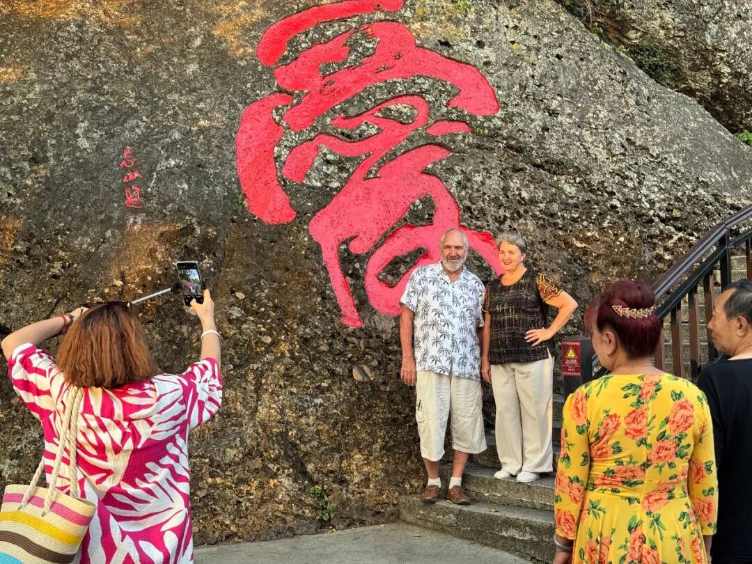 三亚鹿回头“爱”字石刻前,国内游人正帮外国夫妻定格温情瞬间。(图/视觉中国)