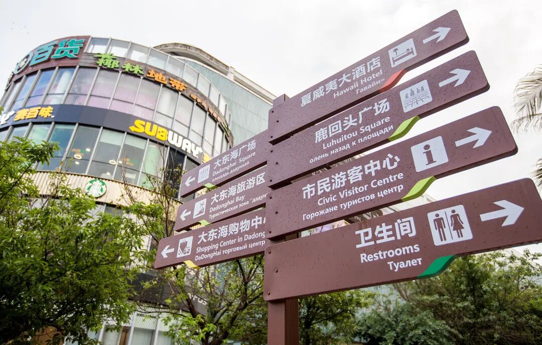 三亚市大东海广场路段的中英俄三语旅游标识牌。(图/视觉中国)