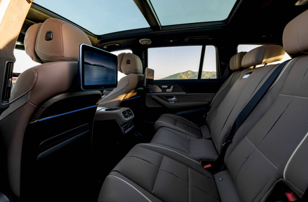 GLS 在座舱技术架构上和 GLE 共享同一套底子,同样标配 MBUX Superscreen,但作为定位更高的全尺寸旗舰,它在后排新增了 2 块 11.6 英寸屏幕,7 个电动座椅也成为全系标配,内饰则新增了「山毛榉棕」配色,有木纹饰板和铝质饰板两种选择。