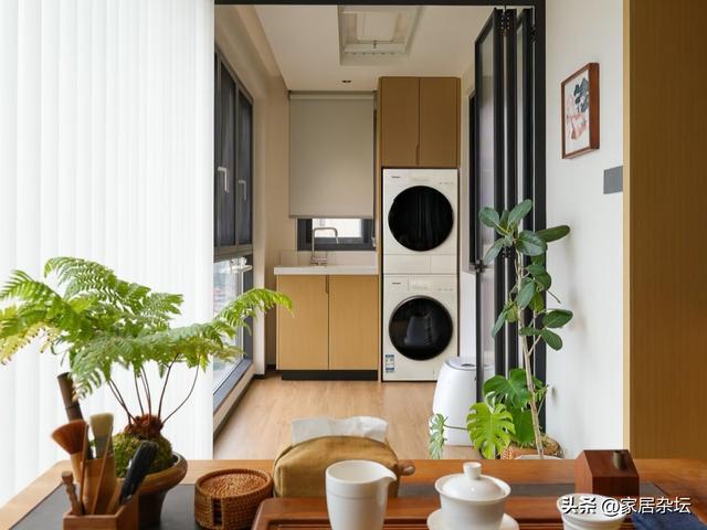 客厅和阳台打通以后,如果找不到晾衣服,还有另外一种方案:在阳台打造一个生活角,将阳台一分为二。