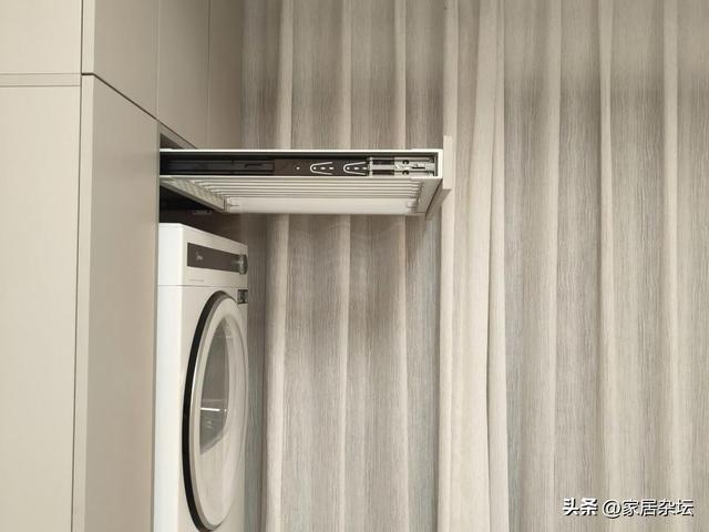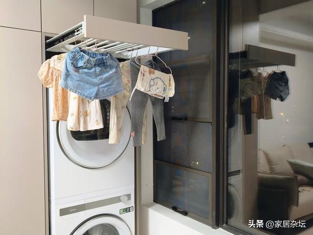 客厅和阳台打通以后,第一个给大家推荐的方案就是:烘干机和晾衣区一体化设计。