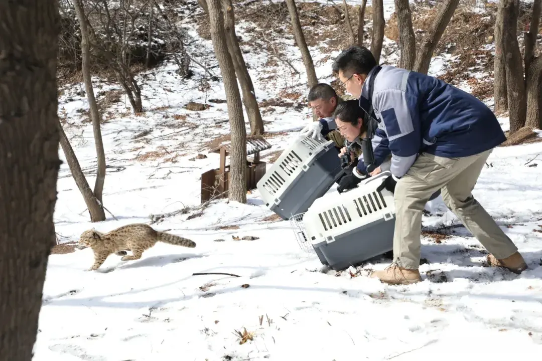 此次放归的金雕,救护与康复历程十分不易。这只金雕曾因无法飞行误入市民家中,经检查发现,它不仅因中度应激出现呼吸心跳异常,还伴有体形瘦弱、中度脱水问题,双腿有外伤且异物侵入,左侧翅膀有贯穿旧伤无法正常收拢。北京市野生动物救护中心工作人员为其实施外科手术取出异物,后续又持续开展握力、飞行、捕食等针对性康复训练,历经近一年悉心照料与野化训练,这只金雕最终达到放归标准。一同归林的秃鹫、鵟类均为体弱或轻微外伤个体,两只豹猫则因误入民居觅食被发现救护,所有动物都在专业干预后,顺利踏上回归自然之路。