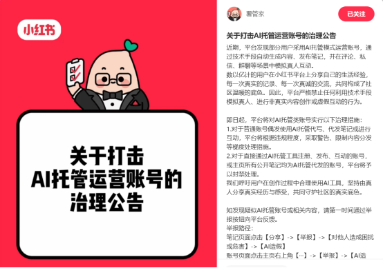 即日起,平台将对AI托管类账号实行以下治理措施: