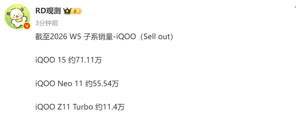 iQOO Neo 11销量约为55.54万部,该机于2025年10月发布,搭载高通骁龙8至尊版,配备6.82英寸2K(3168×1440)珠峰屏,144Hz LTPO自适应刷新率,后置5000万像素索尼LYT-700V主摄(1/1.56英寸大底,OIS光学防抖)+800万像素超广角,内置7500mAh蓝海电池,支持100W有线快充;