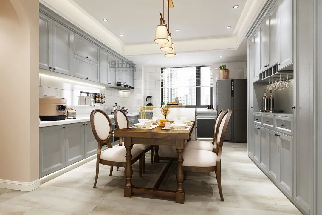 开放式的厨房,厨房与大厅互通成为一个大空间,地面瓷砖建议与大厅通铺过去,这样买瓷砖省事,地面也保持平整大气的效果,而且整体风格效果也更加统一和谐。