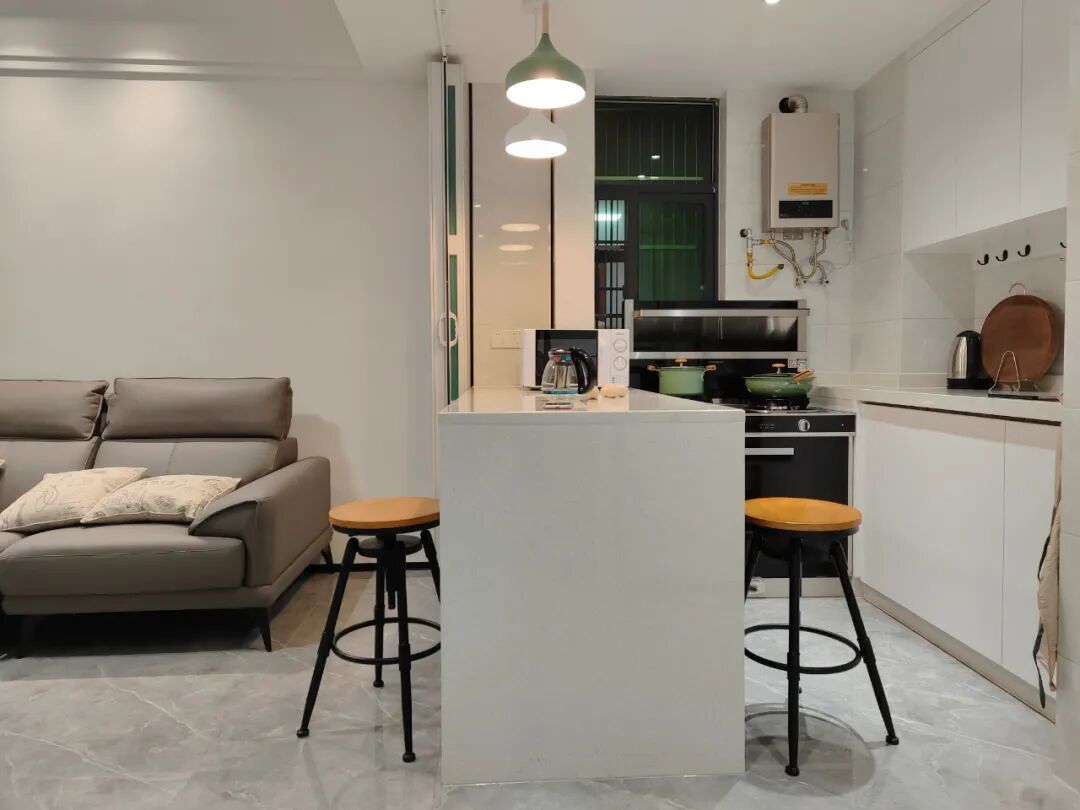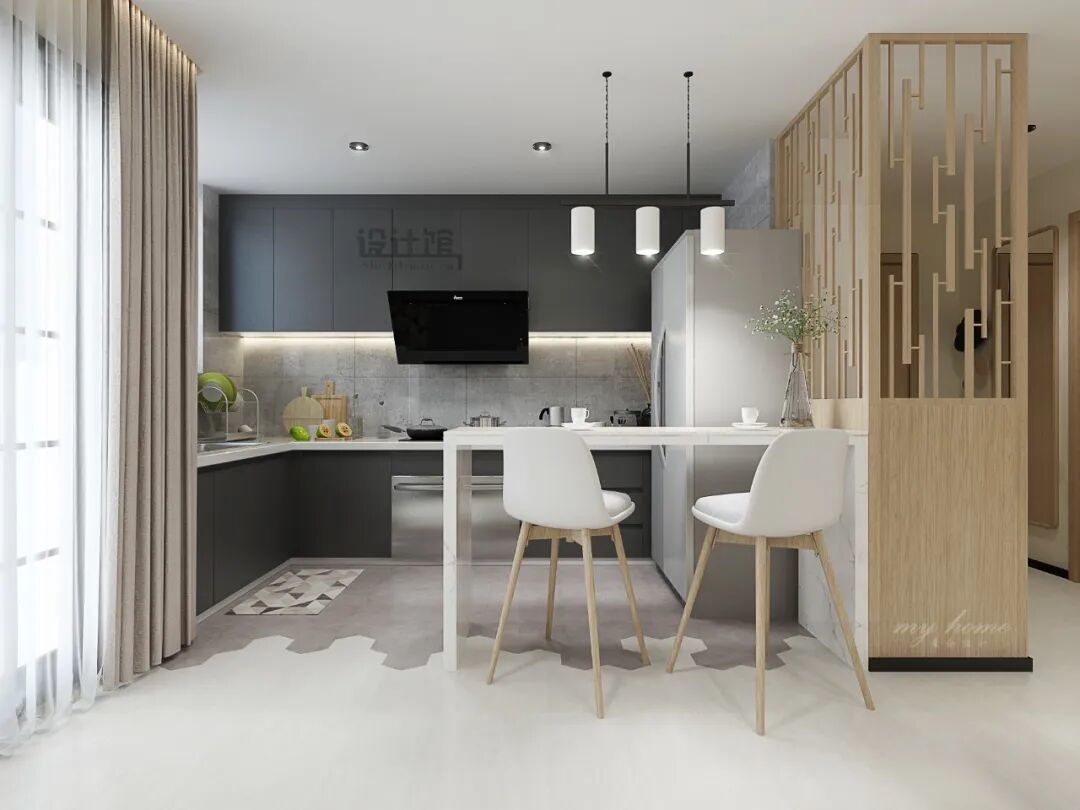 若开放式厨房是靠近玄关区域的话,也可以把厨房的地砖铺出成与玄关一致的,这样厨房就可以选用一些具有防滑的仿古砖了;而大厅则是铺设光亮大气的地砖。让空间分区,同时又能兼顾实用性。