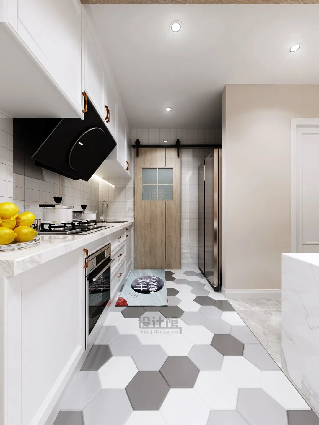 ①厨房与大厅地砖一致:
